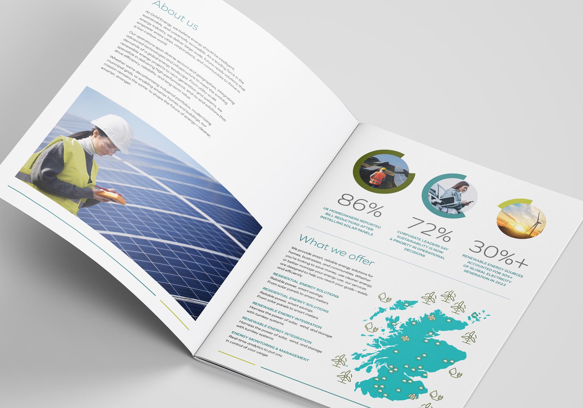 The goal was to create a look and feel that would position Ochil Energy as both credible and community-focused, appealing to a broad audience ranging from homeowners to enterprise clients.